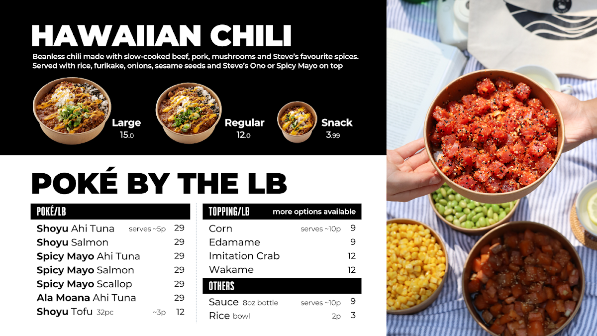 Traditional Hawaiian Poke served island-style. Six scoops of Poke (Shoyu Ahi Tuna & Salmon; Spicy Ahi Tuna, Salmon & Scallop; Ala Moana Ahi) served in a regular bowl. Includes rice, furikake seasoning, Steve’s Shoyu sauce, green onions, and sesame seeds.